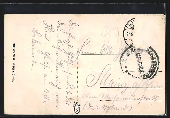 alte Ansichtskarte, gelaufen 1915, Briefmarke entfernt, rückseitig Oberflächenschaden, Stempelspur, guter Zustand