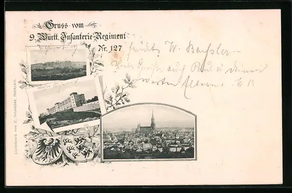 AK Ulm, 9. Württ. Infanterie-Regiment Nr. 127, Teilansicht mit Kirche, Kaserne, Ortspartie
