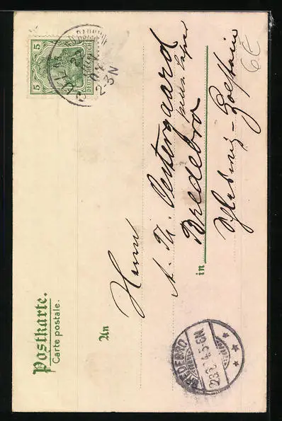Personenbezogene Daten auf der Rückseite der Karte wurden durch blauen Textmarker unkenntlich gemacht. Die blauen Stellen sind auf die Vorderseite durchgeweicht und wirken sich negativ auf das Postkartenfoto aus