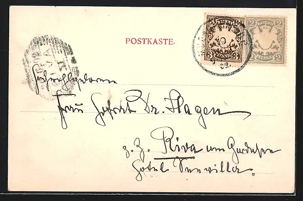 Personenbezogene Daten auf der Rückseite der Karte wurden durch blauen Textmarker unkenntlich gemacht. Die blauen Stellen sind auf die Vorderseite durchgeweicht und wirken sich negativ auf das Postkartenfoto aus