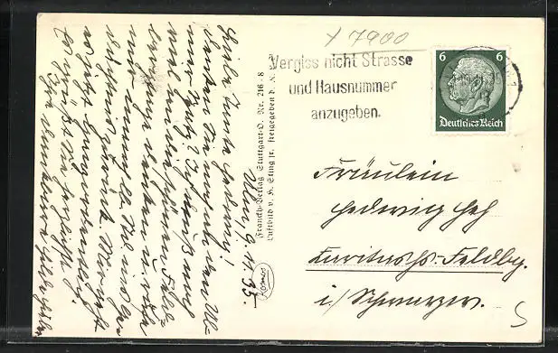 Personenbezogene Daten auf der Rückseite der Karte wurden durch blauen Textmarker unkenntlich gemacht. Die blauen Stellen sind auf die Vorderseite durchgeweicht und wirken sich negativ auf das Postkartenfoto aus