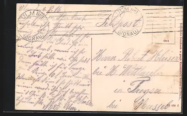Personenbezogene Daten auf der Rückseite der Karte wurden durch blauen Textmarker unkenntlich gemacht. Die blauen Stellen sind auf die Vorderseite durchgeweicht und wirken sich negativ auf das Postkartenfoto aus