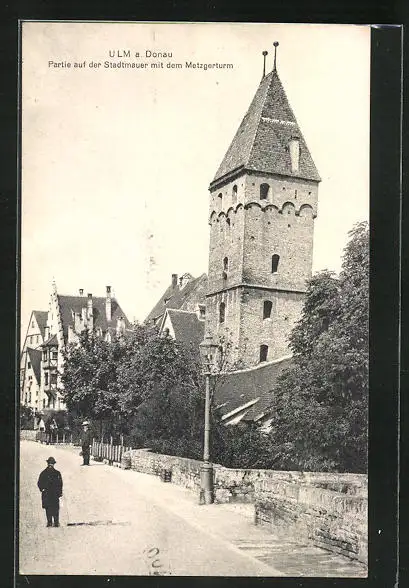 AK Ulm /Donau, Partie auf der Stadtmauer mit dem Metzgerturm