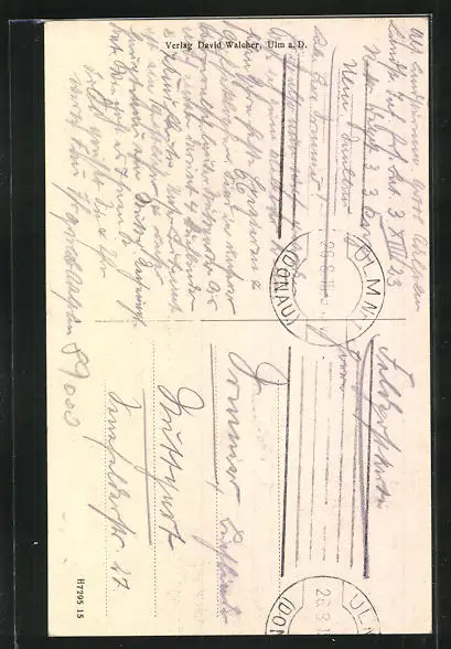 Personenbezogene Daten auf der Rückseite der Karte wurden durch blauen Textmarker unkenntlich gemacht. Die blauen Stellen sind auf die Vorderseite durchgeweicht und wirken sich negativ auf das Postkartenfoto aus