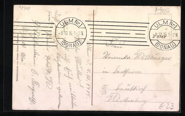 Personenbezogene Daten auf der Rückseite der Karte wurden durch blauen Textmarker unkenntlich gemacht. Die blauen Stellen sind auf die Vorderseite durchgeweicht und wirken sich negativ auf das Postkartenfoto aus