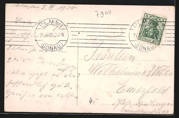 Personenbezogene Daten auf der Rückseite der Karte wurden durch blauen Textmarker unkenntlich gemacht. Die blauen Stellen sind auf die Vorderseite durchgeweicht und wirken sich negativ auf das Postkartenfoto aus