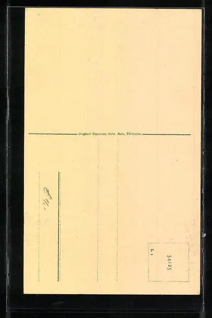 Personenbezogene Daten auf der Rückseite der Karte wurden durch blauen Textmarker unkenntlich gemacht. Die blauen Stellen sind auf die Vorderseite durchgeweicht und wirken sich negativ auf das Postkartenfoto aus