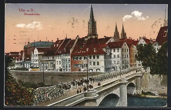 AK Ulm a. D., Donaubrücke mit marschierenden Soldaten