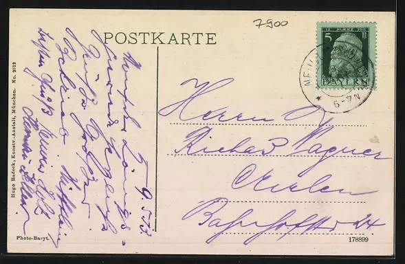 Personenbezogene Daten auf der Rückseite der Karte wurden durch blauen Textmarker unkenntlich gemacht. Die blauen Stellen sind auf die Vorderseite durchgeweicht und wirken sich negativ auf das Postkartenfoto aus
