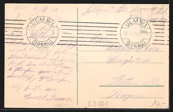 Personenbezogene Daten auf der Rückseite der Karte wurden durch blauen Textmarker unkenntlich gemacht. Die blauen Stellen sind auf die Vorderseite durchgeweicht und wirken sich negativ auf das Postkartenfoto aus