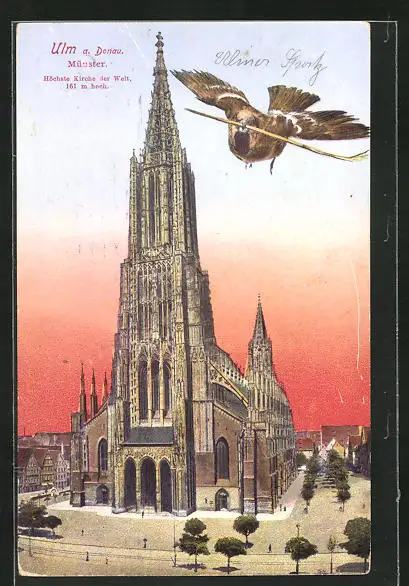 AK Ulm a. Donau, Ulmer Spatz über dem Münster