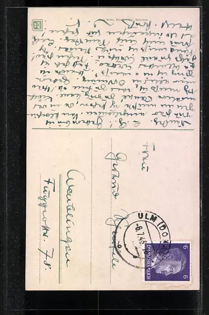 Personenbezogene Daten auf der Rückseite der Karte wurden durch blauen Textmarker unkenntlich gemacht. Die blauen Stellen sind auf die Vorderseite durchgeweicht und wirken sich negativ auf das Postkartenfoto aus