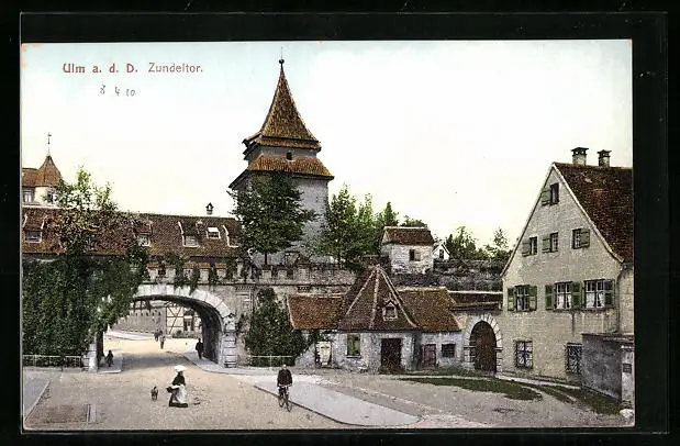 AK Ulm a. d. D., Das Zundeltor mit Passanten