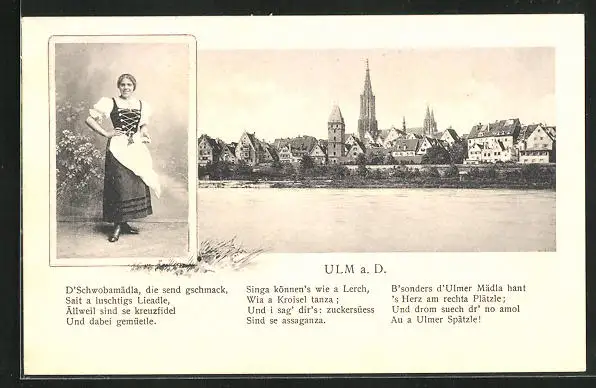 AK Ulm a. d. D., Frau in Tracht, Panorama mit Dom
