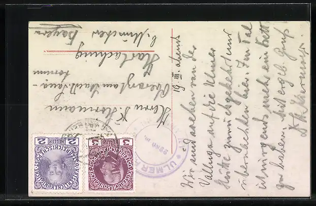 Personenbezogene Daten auf der Rückseite der Karte wurden durch blauen Textmarker unkenntlich gemacht. Die blauen Stellen sind auf die Vorderseite durchgeweicht und wirken sich negativ auf das Postkartenfoto aus