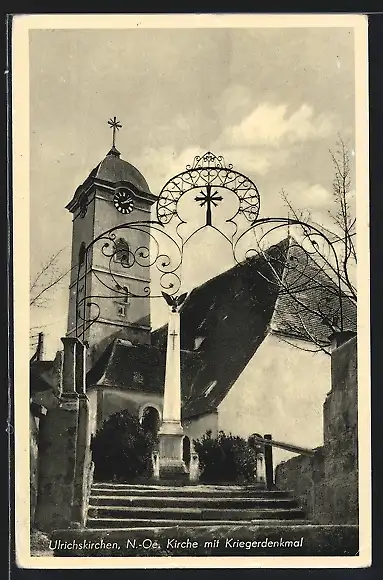 AK Ulrichskirchen /Niederösterreich, Kirche mit Kriegerdenkmal