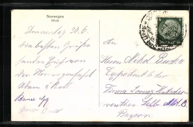 Personenbezogene Daten auf der Rückseite der Karte wurden durch blauen Textmarker unkenntlich gemacht. Die blauen Stellen sind auf die Vorderseite durchgeweicht und wirken sich negativ auf das Postkartenfoto aus