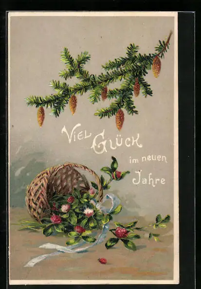AK Umgefallener Korb mit Glücksklee, Glückliches Neujahr