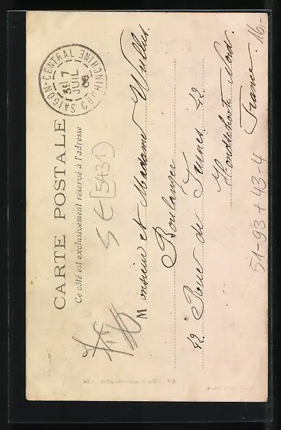Personenbezogene Daten auf der Rückseite der Karte wurden durch blauen Textmarker unkenntlich gemacht. Die blauen Stellen sind auf die Vorderseite durchgeweicht und wirken sich negativ auf das Postkartenfoto aus