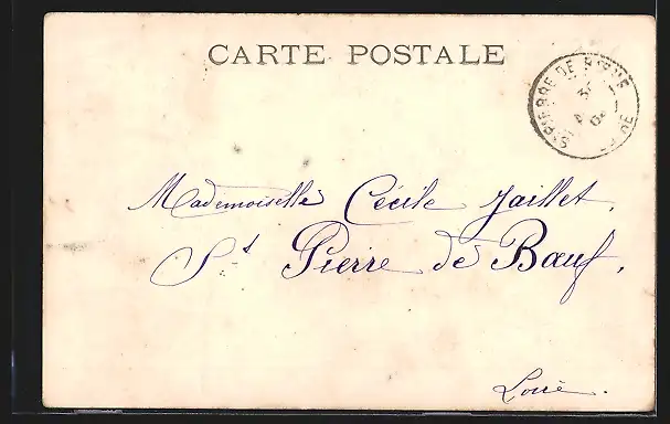 Personenbezogene Daten auf der Rückseite der Karte wurden durch blauen Textmarker unkenntlich gemacht. Die blauen Stellen sind auf die Vorderseite durchgeweicht und wirken sich negativ auf das Postkartenfoto aus