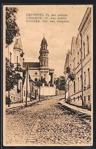 AK Ungvar, Gör. kat. templom, Kirche und Häuserfassaden
