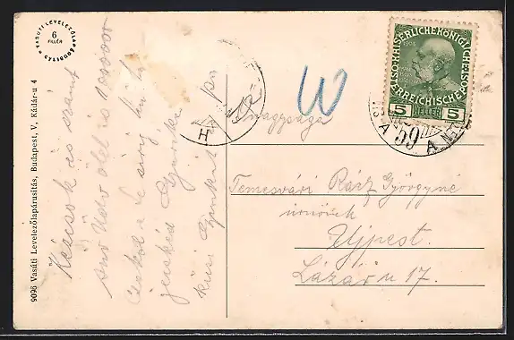 Personenbezogene Daten auf der Rückseite der Karte wurden durch blauen Textmarker unkenntlich gemacht. Die blauen Stellen sind auf die Vorderseite durchgeweicht und wirken sich negativ auf das Postkartenfoto aus