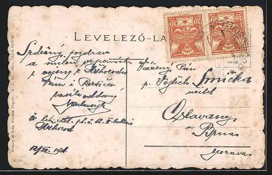 Personenbezogene Daten auf der Rückseite der Karte wurden durch blauen Textmarker unkenntlich gemacht. Die blauen Stellen sind auf die Vorderseite durchgeweicht und wirken sich negativ auf das Postkartenfoto aus
