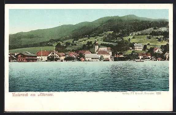 AK Unterach, Ortsansicht mit der Kirche vom Attersee aus