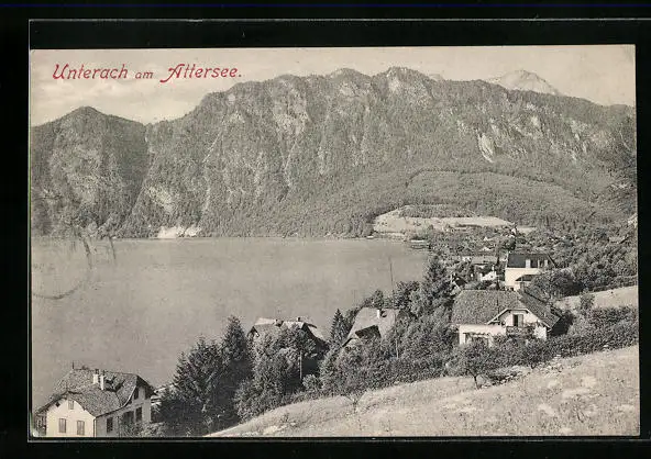 AK Unterach a. Attersee, Ortsansicht mit dem See und Berg