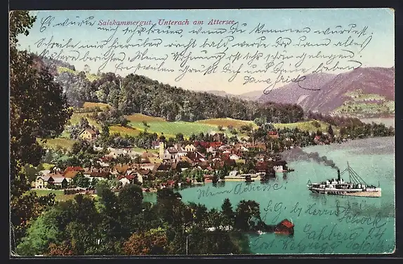 AK Unterach am Attersee, Ortsansicht, Dampfer