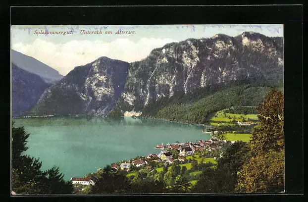 AK Unterach am Attersee, Ortsansicht vor Bergpanorama
