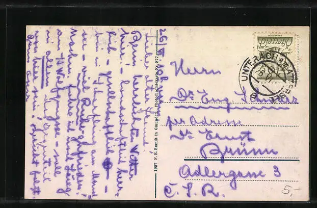 Personenbezogene Daten auf der Rückseite der Karte wurden durch blauen Textmarker unkenntlich gemacht. Die blauen Stellen sind auf die Vorderseite durchgeweicht und wirken sich negativ auf das Postkartenfoto aus