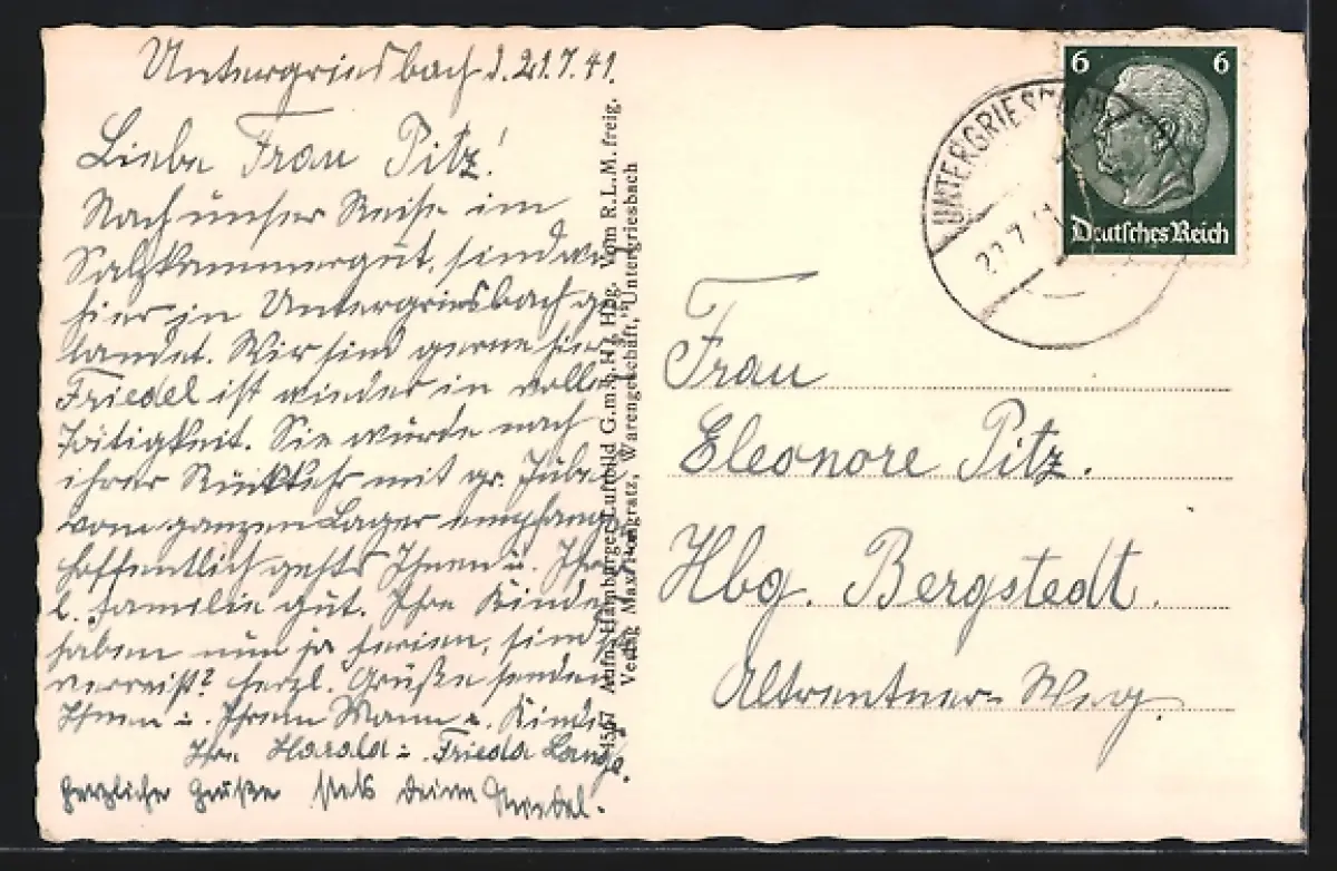 gelaufen 1941, kl. Eckknick rechts unten, guter Zustand