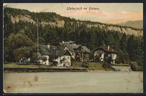 AK Unterjoch bei Goisern, Ortsansicht über das Wasser