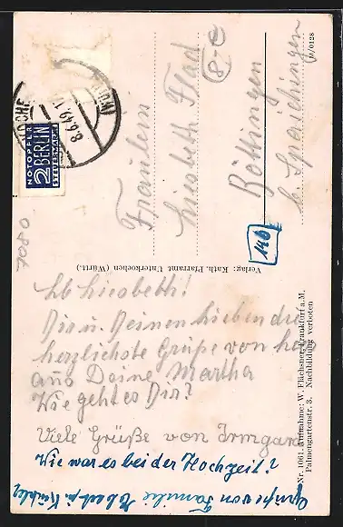 Personenbezogene Daten auf der Rückseite der Karte wurden durch blauen Textmarker unkenntlich gemacht. Die blauen Stellen sind auf die Vorderseite durchgeweicht und wirken sich negativ auf das Postkartenfoto aus