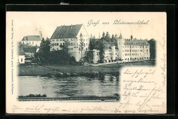 AK Untermarchthal, Ortsansicht mit Fluss und Bahnschienen