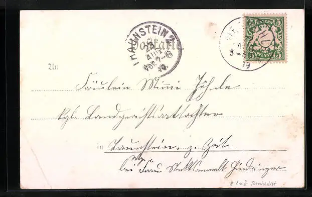 Personenbezogene Daten auf der Rückseite der Karte wurden durch blauen Textmarker unkenntlich gemacht. Die blauen Stellen sind auf die Vorderseite durchgeweicht und wirken sich negativ auf das Postkartenfoto aus