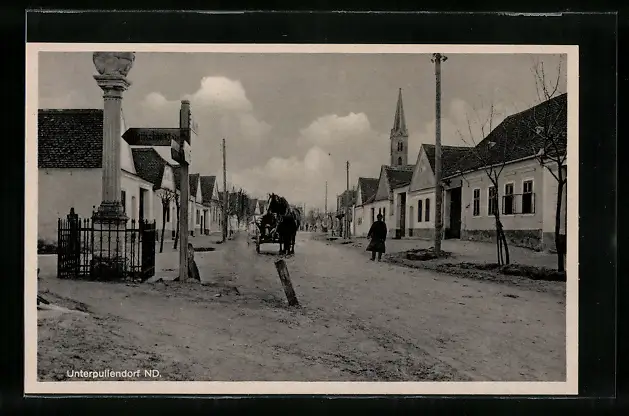 AK Unterpullendorf, Strassenpartie mit Gebäudeansicht und Pferdewagen