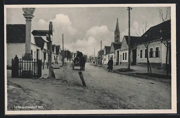 AK Unterpullendorf, Strassenpartie mit Kirche und Denkmal