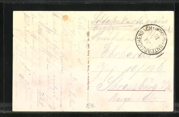 Personenbezogene Daten auf der Rückseite der Karte wurden durch blauen Textmarker unkenntlich gemacht. Die blauen Stellen sind auf die Vorderseite durchgeweicht und wirken sich negativ auf das Postkartenfoto aus