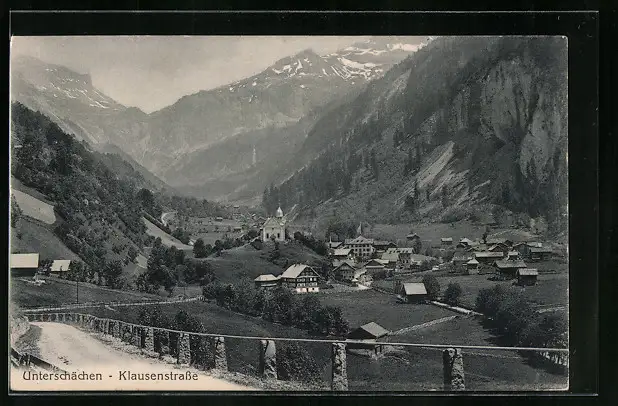AK Unterschächen (Klausstrasse), Ortsansicht vom Weg aus