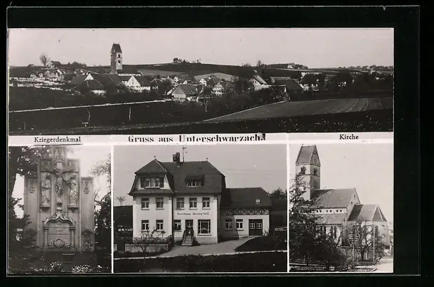 AK Unterschwarzach, Handlung v. Georg Neff, Kirche, Ortsansicht, Kriegerdenkmal