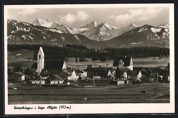 AK Unterthingau i. bayr. Alllgäu, Ortspartie mit Kirche, Edelsberg, Geishorn und Hochvogel