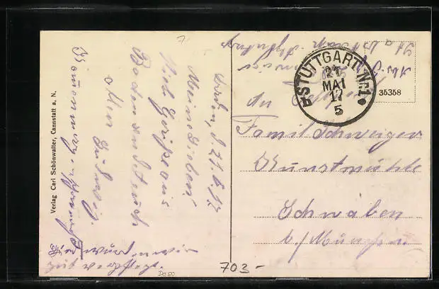Personenbezogene Daten auf der Rückseite der Karte wurden durch blauen Textmarker unkenntlich gemacht. Die blauen Stellen sind auf die Vorderseite durchgeweicht und wirken sich negativ auf das Postkartenfoto aus