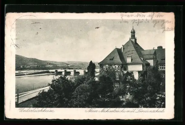 AK Untertürkheim, Neue Neckarbrücke mit Lindenschule