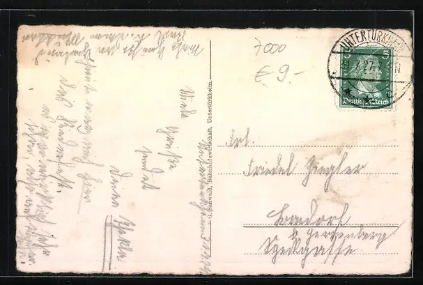 Personenbezogene Daten auf der Rückseite der Karte wurden durch blauen Textmarker unkenntlich gemacht. Die blauen Stellen sind auf die Vorderseite durchgeweicht und wirken sich negativ auf das Postkartenfoto aus