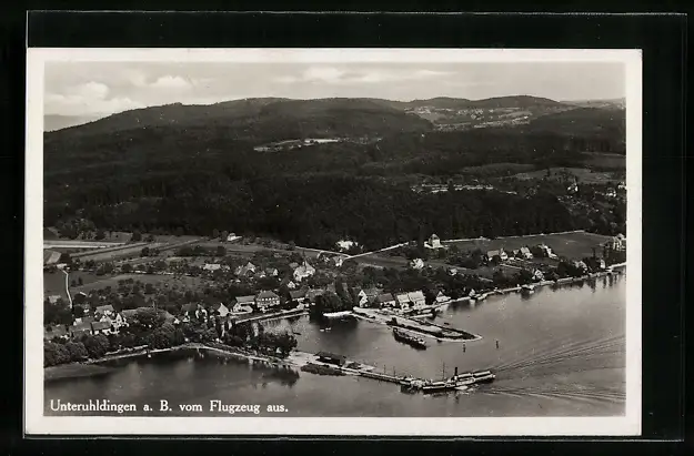 AK Unteruhldingen, Panorama vom Flugzeug aus mit Dampfer