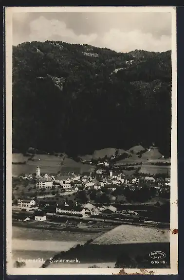 AK Unzmarkt /Steiermark, Ortsansicht aus der Vogelschau mit Bahnhof