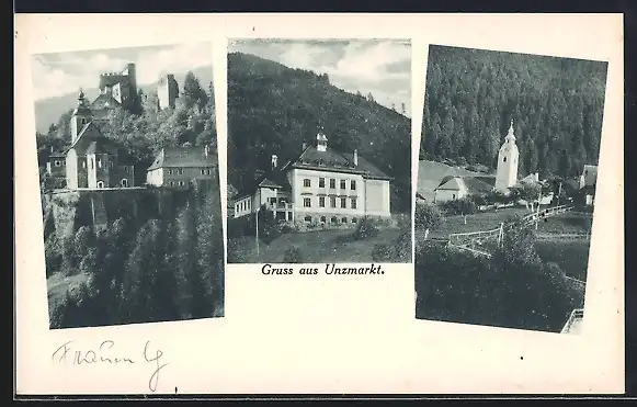 AK Unzmarkt, Teilansicht mit Burg, Kirche, Weisses Gebäude