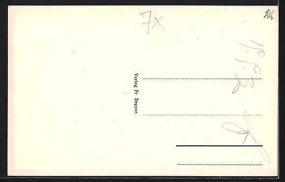 Personenbezogene Daten auf der Rückseite der Karte wurden durch blauen Textmarker unkenntlich gemacht. Die blauen Stellen sind auf die Vorderseite durchgeweicht und wirken sich negativ auf das Postkartenfoto aus